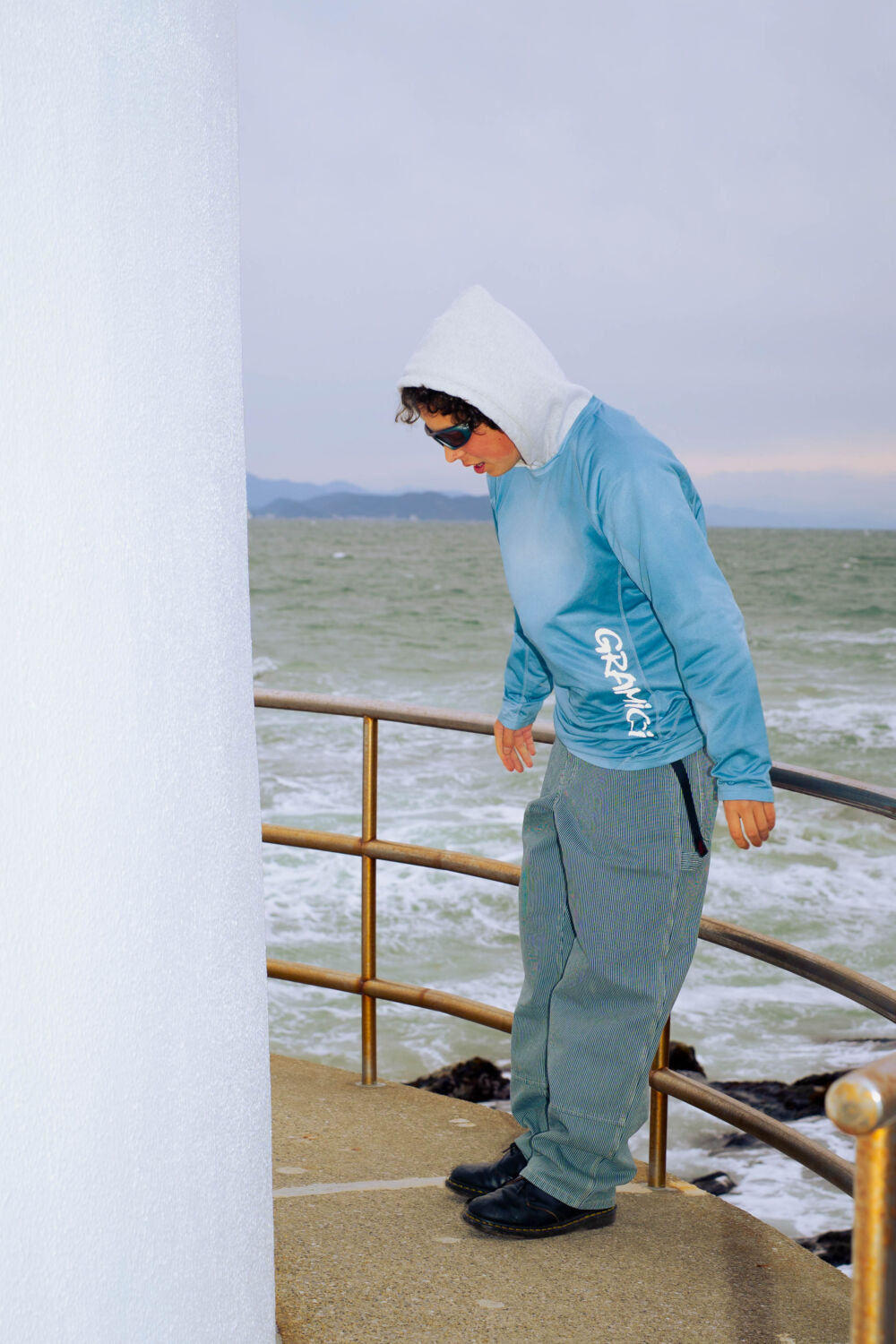 グラミチのロンTは今の気分にもぴったりなスポーティーなシルエットと、目立ちすぎずに、なおかつ鮮やかなスカイブルーが魅力的なポイント。撮影当日はまだ肌寒さの残る3月前半だったから、あえてパーカーの上に着込む重ね着コーデで、個性を演出。そしてボトムスには、春らしくヒッコリーのワークパンツをチョイスすれば、遊び心も満タンでバイブスを上げていけそうだ。