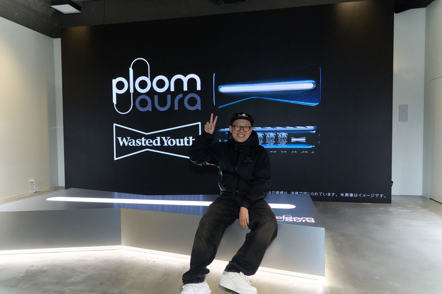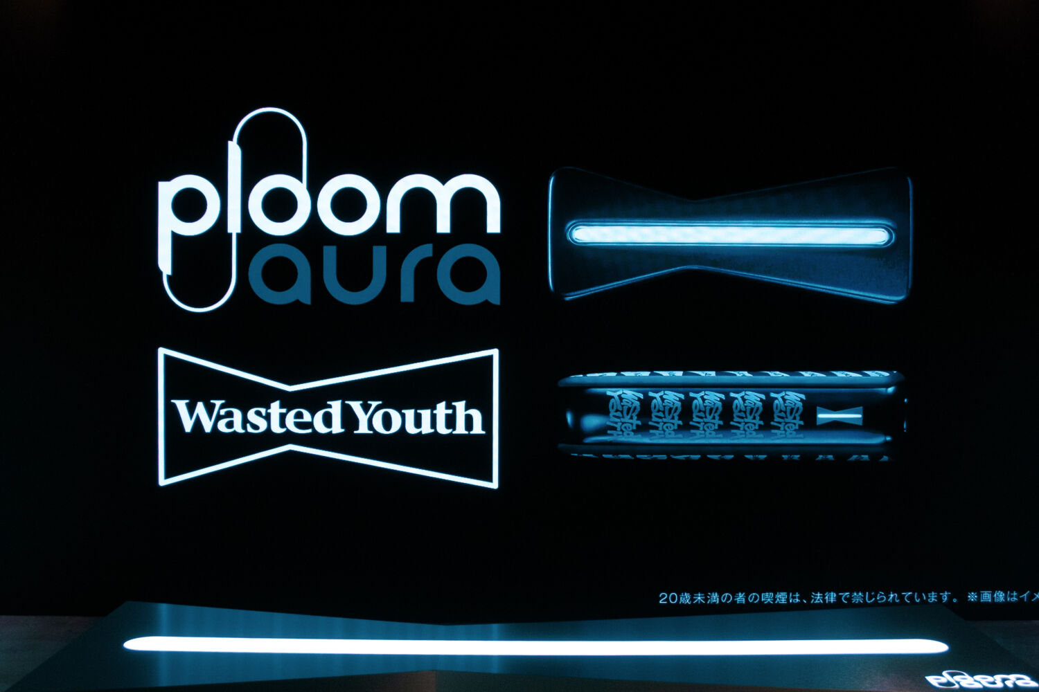 会場は本コラボレーションを象徴する“ネイビー×ホワイト”を基調に、シンプルかつスタイリッシュな「Ploom AURA」のデザインイメージをVERDYがさらにブラッシュアップ。自身のプロジェクトのひとつ〈Wasted Youth〉を象徴するアイコニックなリボンモチーフや、大型LEDビジョンに映し出されるグラフィックCG、それらを幻想的にまとめ上げる照明・空間演出など、近未来的なアウトプットから両者の先進的な立ち位置を改めて提示した。